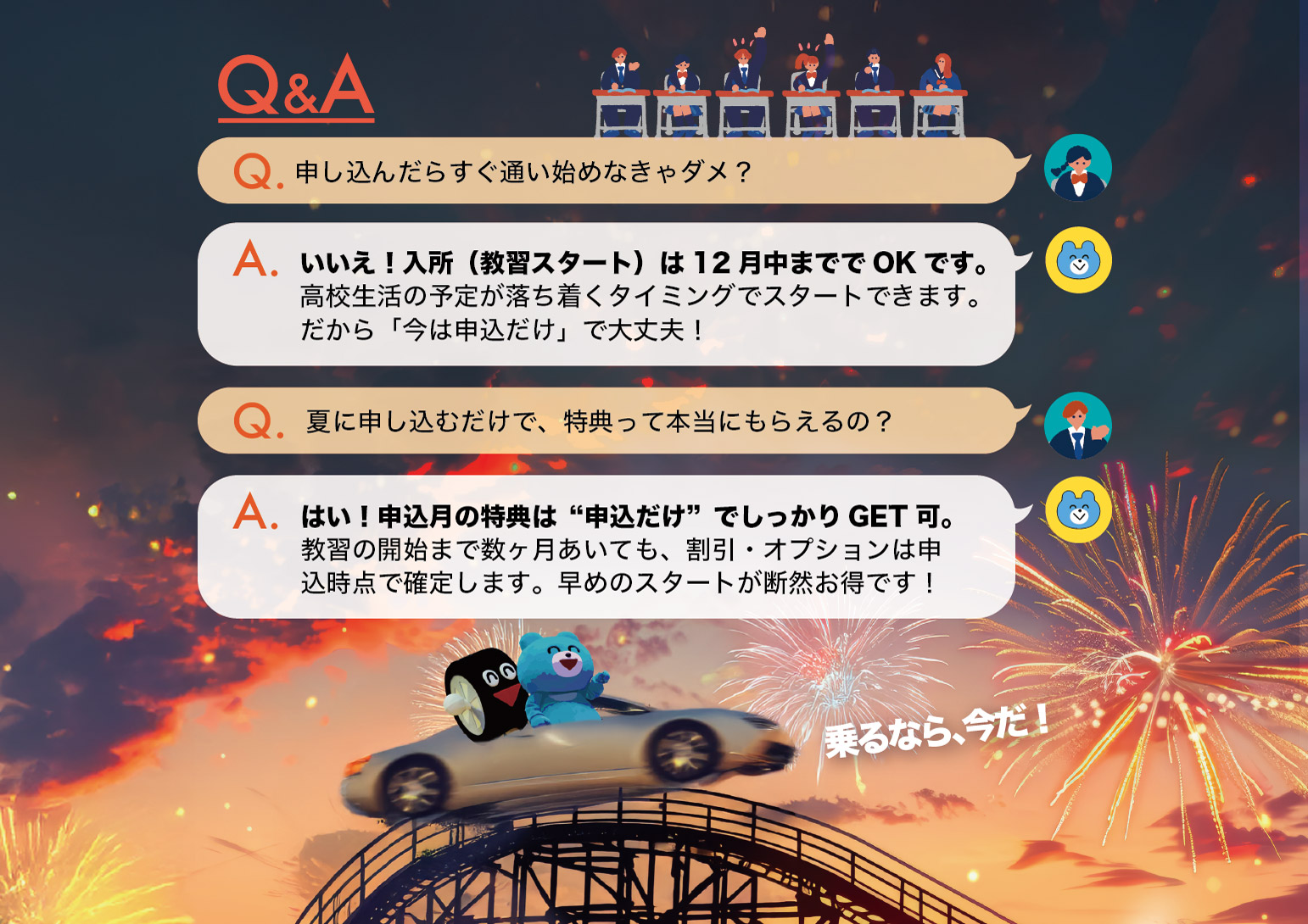 A.大丈夫です!年内に入所すればOK!さらに言うと、、教習期限は入所から9ヶ月なので、来年にじっくり進めることも出来ちゃいます!