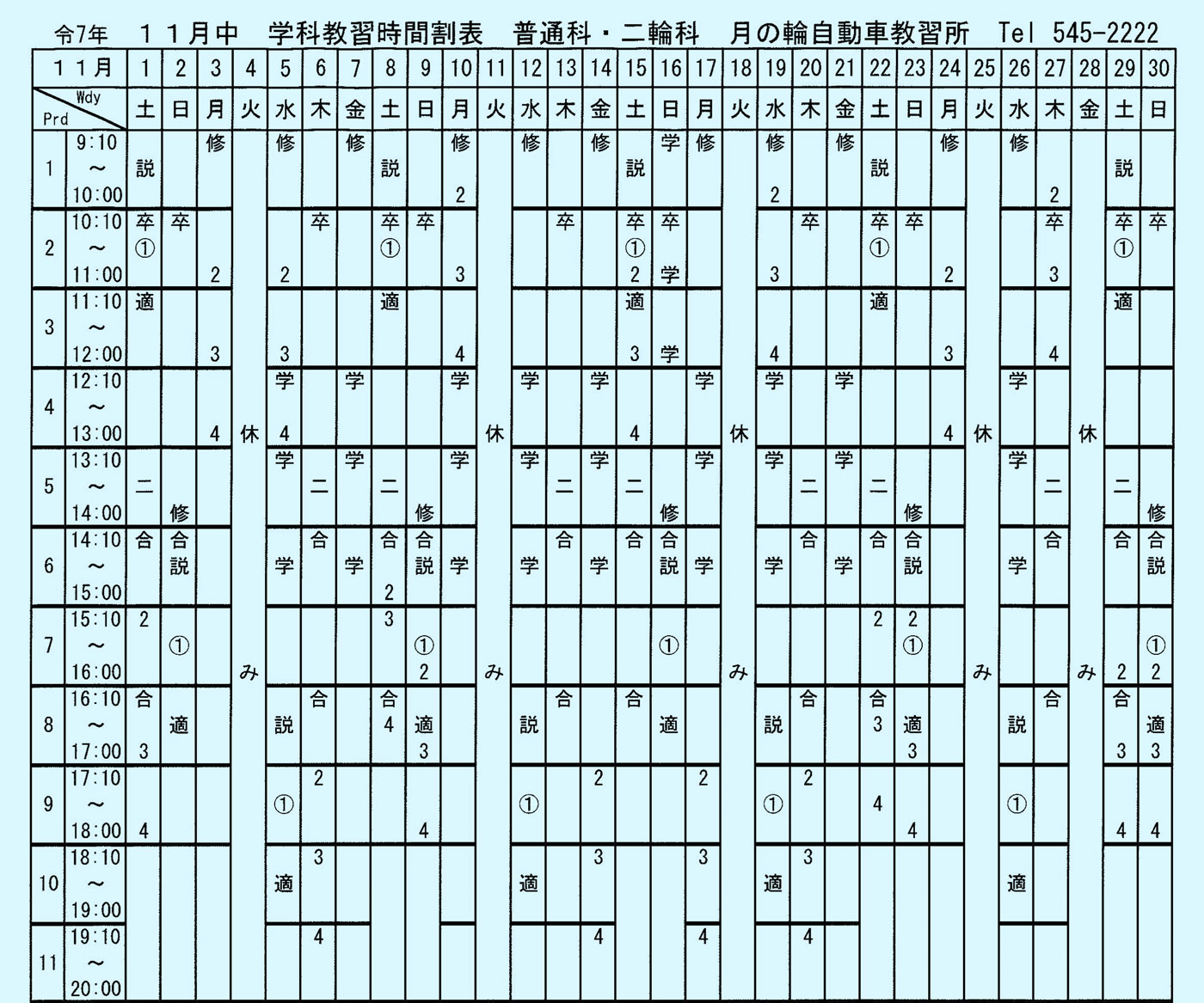 仮学科試験の実施日や、二段階の応急救護学科(2~4)についてはこちらの時間割表でご確認下さい